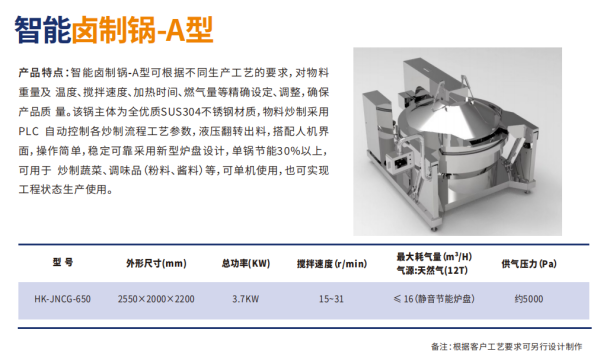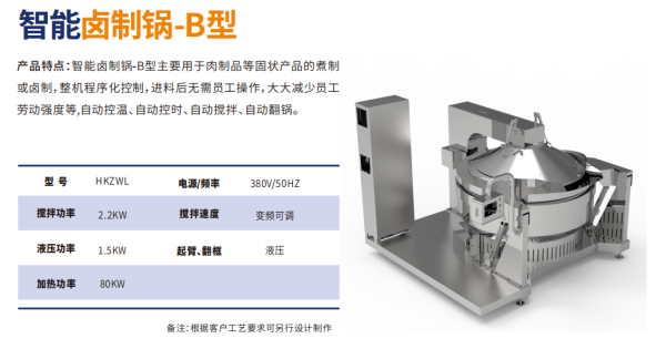 主要?于?制品等固狀產(chǎn)品的煮制或?制,整機程序化控制,進料后?需員?操作,??減少員?勞動強度等,?動控溫、?動控時、?動攪拌、?動翻鍋。